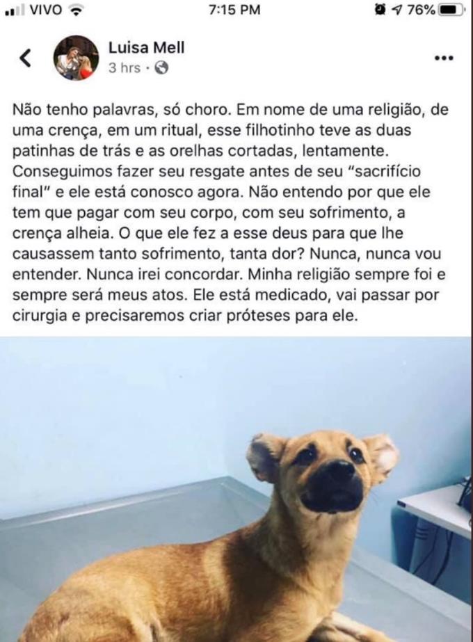 “Em nome de uma religião, de uma crença, em um ritual, esse filhotinho teve as duas patinhas de trás e as orelhas cortadas, lentamente. Conseguimos fazer o resgate antes de seu ‘sacrifício final’ e ele está conosco agora. Não entendo porque ele tem que pagar com seu corpo, com seu sofrimento, a crença alheia. O que ele fez a esse Deus para que lhe causassem tanto sofrimento, tanta dor? Nunca, nunca vou entender, nunca vou concordar. Minha religião sempre foi e sempre será meus atos. Ele está medicado, vai passar por cirurgia e precisamos criar próteses para ele”, escreveu Luisa.