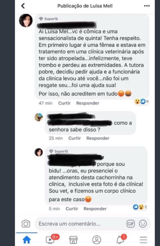Nos comentários, uma internauta comentou: “Ai Luisa Mell… você é cômica e uma sensacionalista de quinta! Tenha respeito. Em primeiro lugar é uma fêmea e estava em tratamento em uma clínica veterinária após ter sido atropelada… infelizmente, teve trombo e perdeu as extremidades. A tutora pobre, decidiu pedir ajuda e a funcionária da clínica levou até você… não foi um resgate seu… foi uma ajuda sua! Por isso não acreditem em tudo”, disse a mulher.