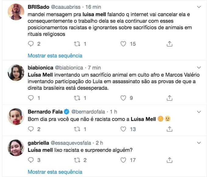 “Milhões de animais abatidos pela indústria todos os dias mas a Luisa Mell prefere inventar mentiras e continuar sendo RACISTA, incitando preconceito contra religiões afro”, escreveu outra pessoa.