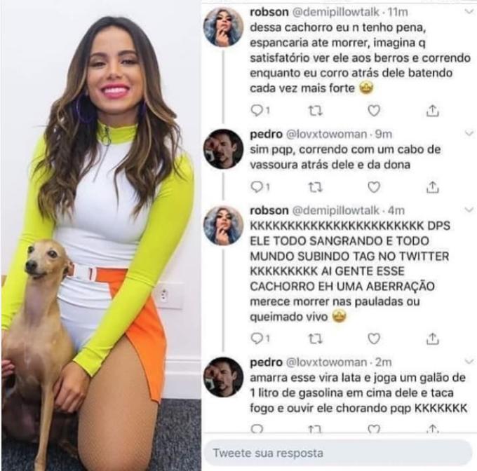 A apresentadora ainda compartilhou uma foto de Anitta ao lado de seu pet e alguns dos comentários, que diziam coisas como "espancaria até morrer" e "imagina que satisfatório ver ele aos berros e correndo enquanto eu corro atrás dele batendo cada vez mais forte".