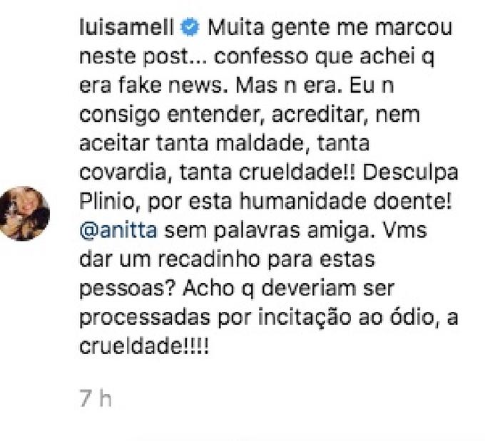 "Confesso que achei que era fake news, mas não era. [...] Desculpa, Plínio, por esta humanidade doente! Anitta, sem palavras, amiga. Vamos dar um recadinho para estas pessoas? Acho que deveriam ser processadas por incitação ao ódio, à crueldade!", lamentou Luisa em seu Instagram.