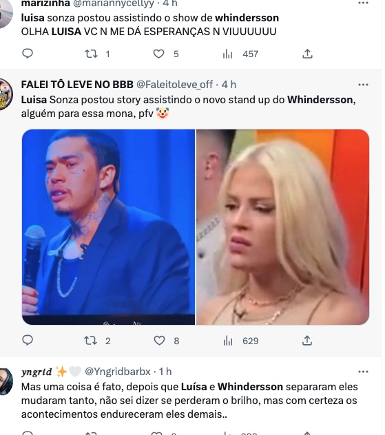 A cantora postou em seu instagram que está assistindo ao show de Whindersson na Netflix e elogiou o ex-marido: "Não dá <3", escreveu Luísa, marcando Whindersson na postagem.