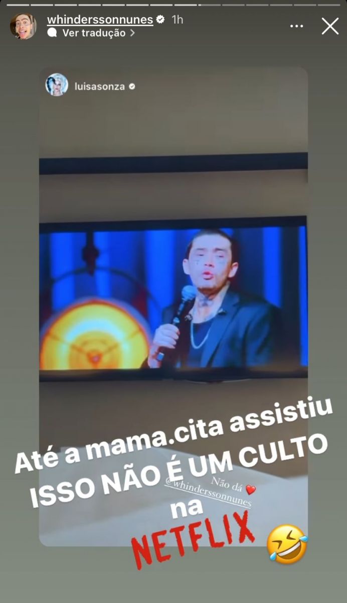 O humorista repostou o storie da cantora, e brincou: "até a mamacita assistiu Isso não é um culto na Netflix", escreveu ele, em referência ao último sucesso da cantora.