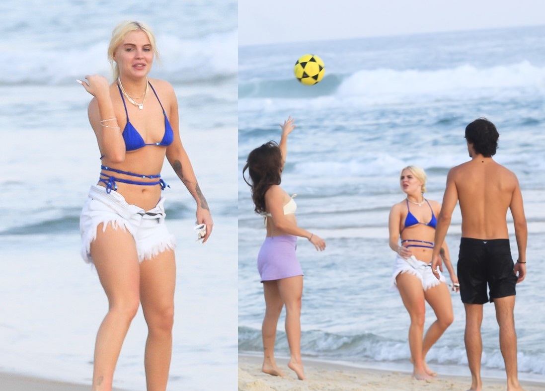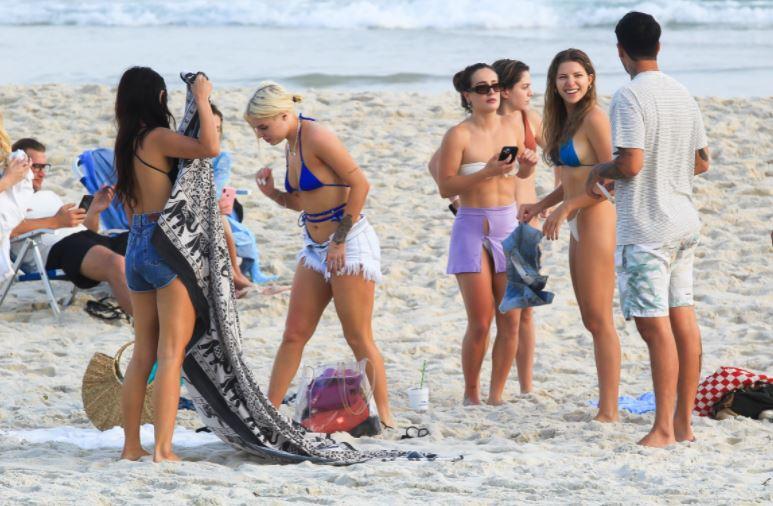 Luísa Sonza e Bruna Griphao se reuniram para aproveitar o sábado de calor e jogaram altinha com amigos, na praia da Barra da Tijuca, no Rio de Janeiro.