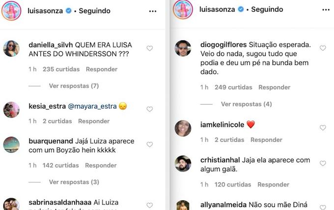 Várias pessoas, na maioria mulheres, acusaram a cantora de ter se promovido em cima de Whindersson Nunes e agora tê-lo “abandonado”. Os comentários estão em várias fotos da cantora no Instagram, inclusive, nas antigas em que aparece com o youtuber.