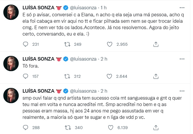 "Sempre ouvi falar que quando artista tem sucesso cola muito sanguessuga e gente que quer teu mal em volta e nunca acreditei muito. Sempre acreditei no bem e que as pessoas eram massa, hoje aos 24 anos me pego assustada em ver que realmente, a maioria só quer te sugar e não liga de verdade para você.", disse Luísa.