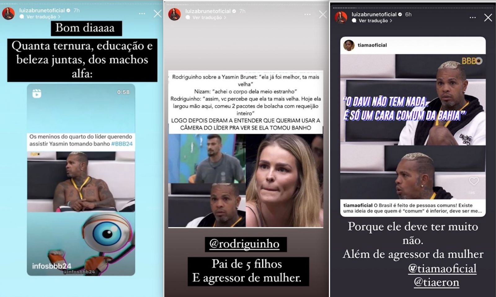 Luiza Brunet usou o stories do Instagram para detonar Rodriguinho, que hoje pela manhã criticou o corpo de Yasmin Brunet em conversa com os brothers.