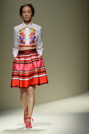 ©afp.com / FILIPPO MONTEFORTE Modelo desfila coleção de verão da Alberta Ferretti nesta quarta-feira, 18 de setembro de 2013, em Milão.