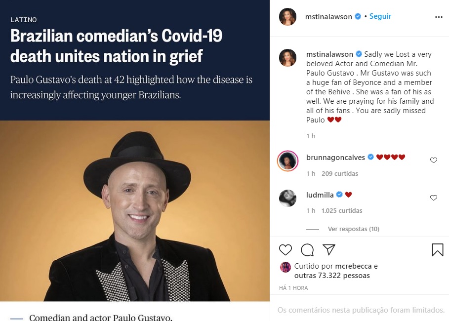 Na legenda do post, Tina escreveu: “Infelizmente perdemos um amor e comediante muito amado, sr Paulo Gustavo; Sr Gustavo era um grande fã de Beyoncé e um membro da Beyhive. Ela [Beyoncé] também era fã dele. Estamos rezando por sua família e seus fãs. Você fará falta, Paulo".