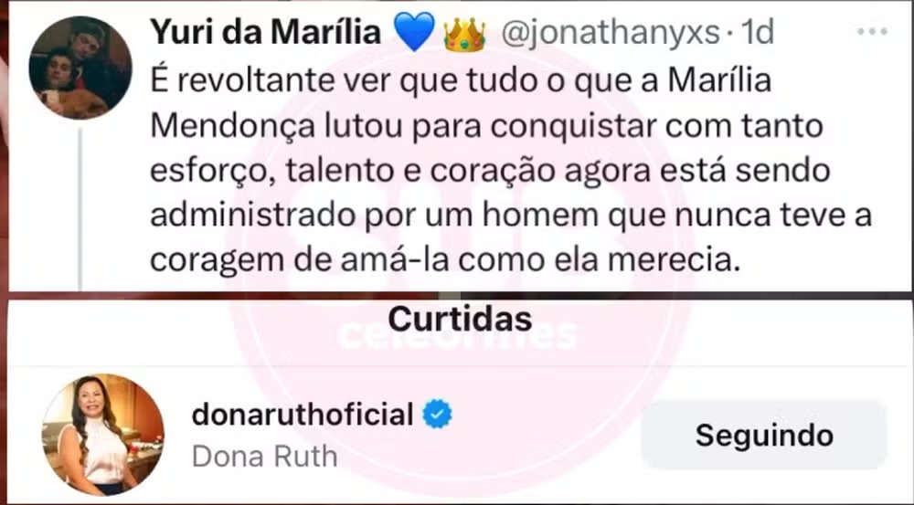 O post em questão foi feito por um internauta indignado com a decisão da Justiça, que concedeu a guarda provisória de Léo a Murilo. "É revoltante ver que tudo o que a Marília Mendonça lutou para conquistar com tanto esforço, talento e coração agora está sendo administrado por um homem que nunca teve coragem de amá-la como ela merecia", dizia o post.