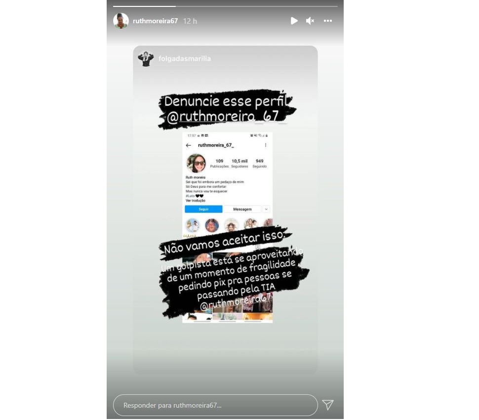 No perfil oficial de Ruth, ela denunciou a situação: “Denuncie esse perfil. Não vamos aceitar isso um golpista está se aproveitando de um momento de fragilidade pedindo pix para as pessoas se passando pela tia Ruth".