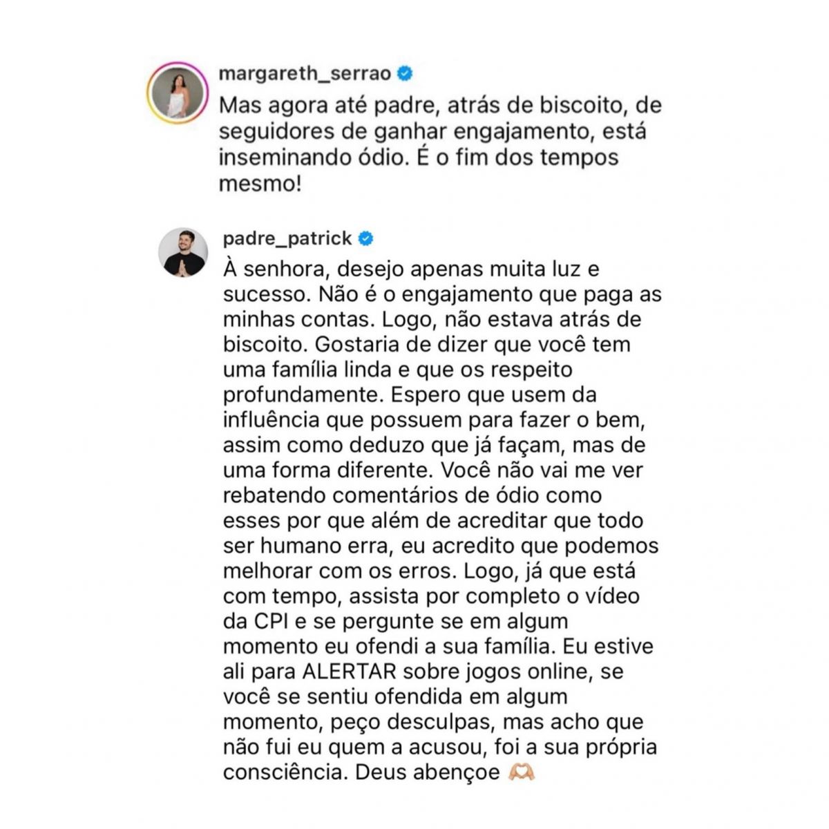 O padre Patrick Fernandes respondeu publicamente a Margareth Serrão, mãe da influenciadora Virgínia Fonseca, nesta quarta-feira (21 após ser criticado por sua participação na CPI das Bets, na qual deu um depoimento para conscientização dos problemas relacionados ao vício em apostas, e comentou sobre a influência de famosos na divulgação de jogos de azar.