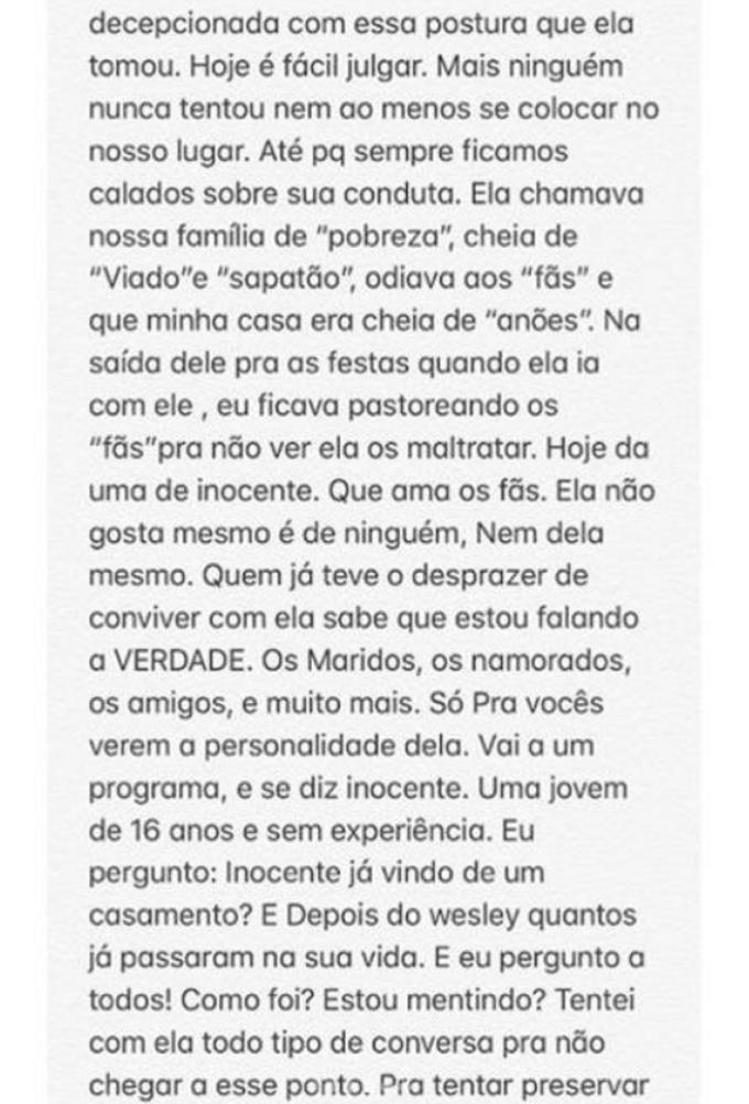 "Ela está usando fakes para fazer todo esse terror. Há três anos eu investigo e no fundo eu acreditava que ela não estivesse envolvida. Ela chamava nossa família de pobreza, cheia de 'viado' e 'sapatão', odiava os fãs e que minha casa era cheia de anões. Na saída dele para as festas, quando ela ia com ele, eu ficava pastoreando os fãs para que ela não os maltratasse. Agora dá uma de inocente e diz que ama os fãs. Ela não gosta de ninguém. Nem dela mesma", detonou: