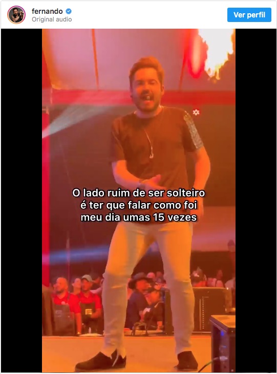 O cantor fez questão de exibir a solteirice ao publicar um vídeo em que aparece dançando durante um show. “O lado ruim de ser solteiro é ter que falar como foi meu dia umas 15 vezes”, legendou.