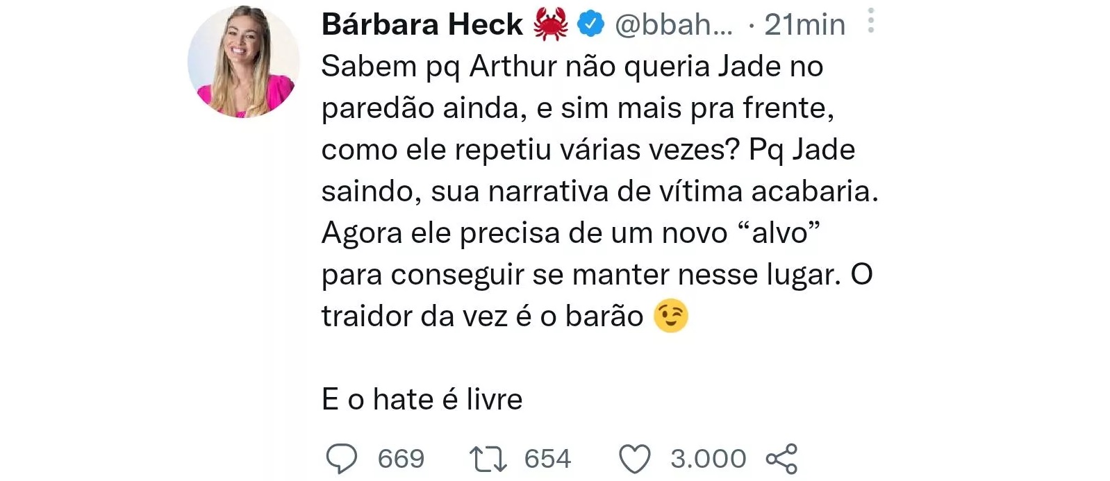 No post de Bárbara, a ex-sister afirma: "Sabem porque Arthur não queria Jade no paredão ainda e sim mais para frente como ele repetiu tantas vezes? Porque Jade saindo, sua narrativa de vítima acabaria", avaliou ela, baseada na rivalidade que Jade tinha com Arthur.