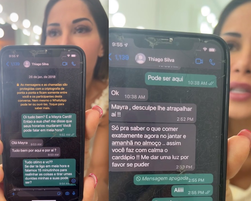 Ela também exibiu um áudio e prints de Thiago Silva pedindo orientações sobre o que comer no decorrer do dia, além de fotos de Belle e Thiago se exercitando com os personal trainers da empresa de Maíra, a "Seca Você".