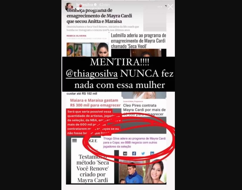 "Mentira! Thiago Silva nunca fez NADA com essa mulher“, escreveu Belle.