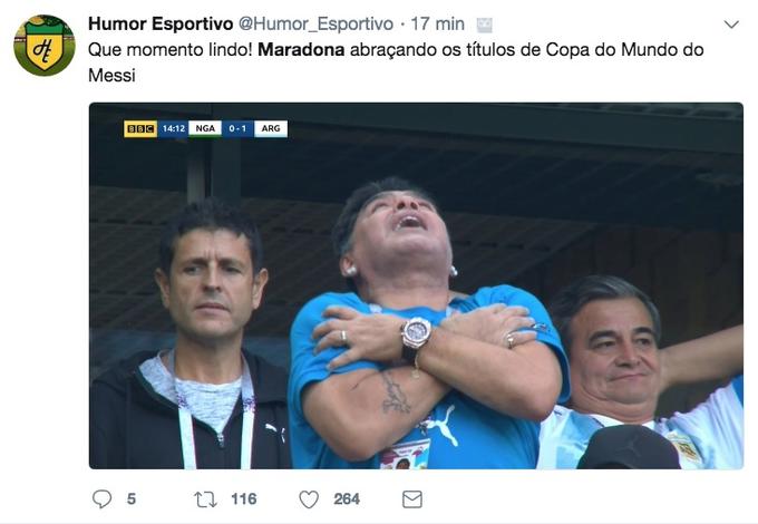 Diego Maradona está no estádio acompanhando o jogo da Argentina contra a Nigéria pela Copa do Mundo e não conteve a emoção ao ver o gol de Messi.