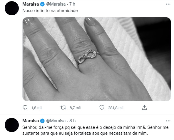 Em seguida, ela publicou uma foto usando o anel do infinito. “Nosso infinito na eternidade”. Marília e as irmãs Maiara e Maraisa eram muito amigas e se preparavam para lançar uma turnê.