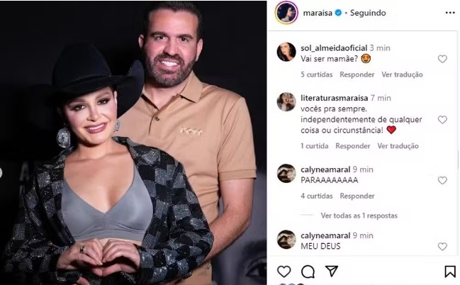 Nos comentários, fãs foram à loucura com a possibilidade. "Vai ser mamãe", questionou um perfil. "Maraisa mulher, não faz isso com a gente", publicou outra conta.