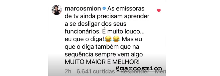 “As emissoras de tv ainda precisam aprender a se desligar dos seus funcionários. É muito louco…eu que o diga! Mas eu que o diga também que na sequência sempre vem algo MUITO MAIOR E MELHOR!”, escreveu Mion.
