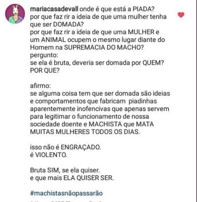 “Onde é que está a piada? Por que faz rir a ideia de que uma mulher tenha que ser domada? Por que faz rir a ideia de que uma mulher e um animal ocupem o mesmo lugar diante do homem na supremacia do macho? Pergunto: se ela é bruta, deveria ser domada por quem? Por que? Afirmo: se alguma coisa tem que ser domada são ideias e comportamentos que fabricam piadinhas aparentemente inofensivas que apenas servem para legitimar o funcionamento de nossa sociedade doente e machista que mata muitas mulheres todos os dias. Isso não é engraçado. É violento. Bruta, sim, se ela quiser. E que mais ela quiser ser. Machistas não passarão”, escreveu.