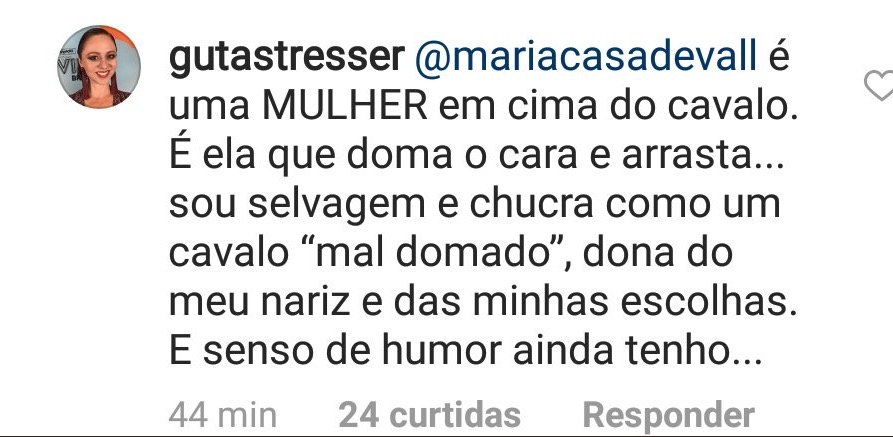 “Maria Casadevall é uma mulher em cima do cavalo. É ela que doma o cara e arrasta… sou selvagem e chucra como um cavalo “mal domado”, dona do meu nariz e das minhas escolhas. E senso de humor ainda tenho…”. rebateu Guta.
