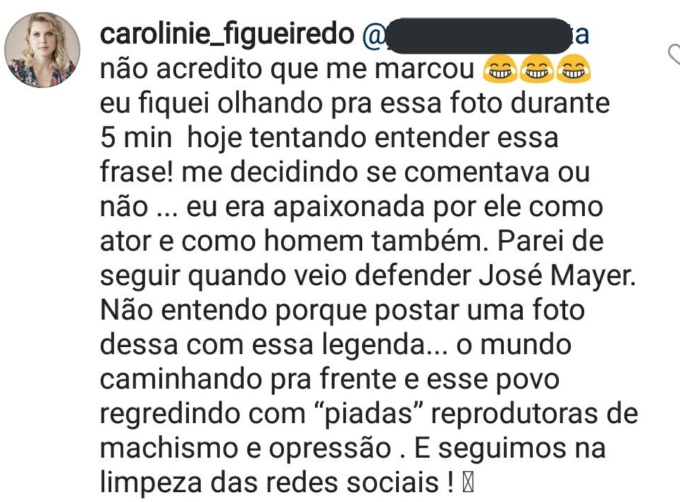Outras famosas também comentaram sobre o post e dividiram opiniões. Caroline Figueiredo criticou Caio e deixou claro que gostava dele como ator e pessoal antes de defender José Mayer, acusado de assédio sexual. “Parei de seguir quando veio defender o José Mayer. Não entendo porque postar uma foto dessa com essa legenda… o mundo caminhando pra frente e esse povo regredindo com “piadas” reprodutoras de machismo e opressão”, escreveu.