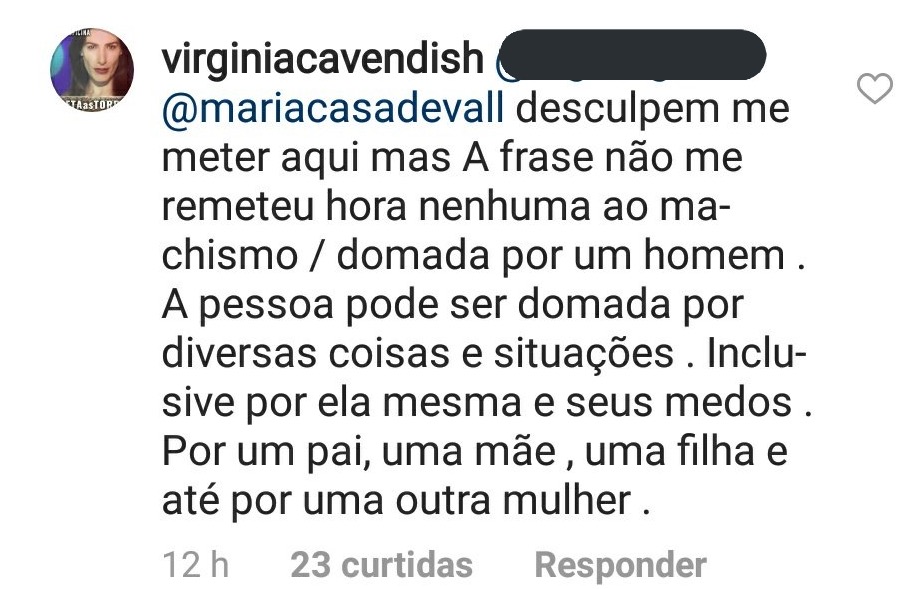 Já Guta Stress e Virginia Cavendish defenderam o Caio rebatendo o que foi dito por Casadevall. “Desculpem me meter aqui, mas a frase não me remeteu hora nenhuma ao machismo / domada por um homem. A pessoa pode ser domada por diversas coisas e situações. Inclusive por ela mesma e seus medos”, escreveu Virginia.