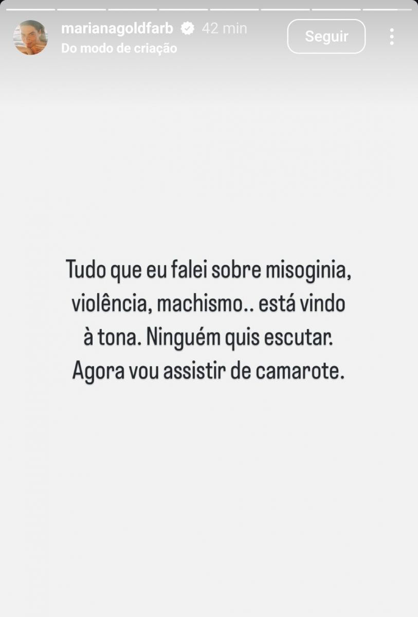 “Tudo que eu falei sobre misoginia, violência, machismo… Está vindo à tona. Ninguém quis escutar, agora vou assistir de camarote”, escreveu ela.