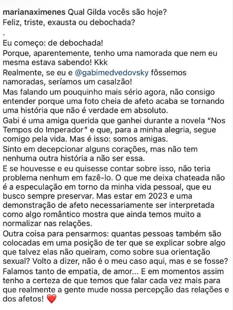 Mariana Ximenes se manifestou sobre os rumores de que estaria namorando a atriz Gabi Medvedovski, com quem começou uma forte amizade após as duas contracenarem em "Nos Tempos do Imperador".