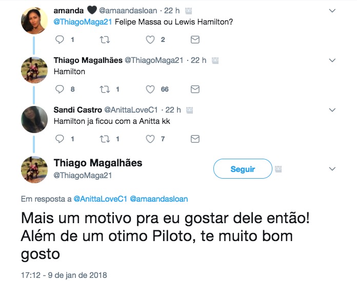 “Hamilton já ficou com a Anitta”, disse a pessoa tirando sarro. “Mais um motivo pra eu gostar dele! Além de um ótimo piloto, tem muito bom gosto”, ironizou Thiago.