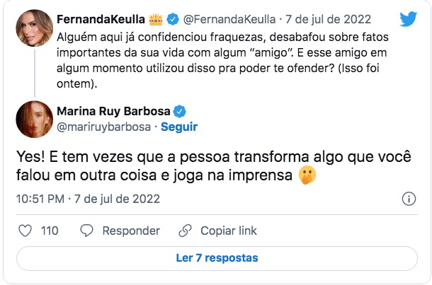 Marina Ruy Barbosa tem alfinetado uns e outros através das redes sociais nos últimos dias. Dessa vez, a atriz criticou um “amigo da onça” ao comentar num tuíte de Fernanda Keulla.