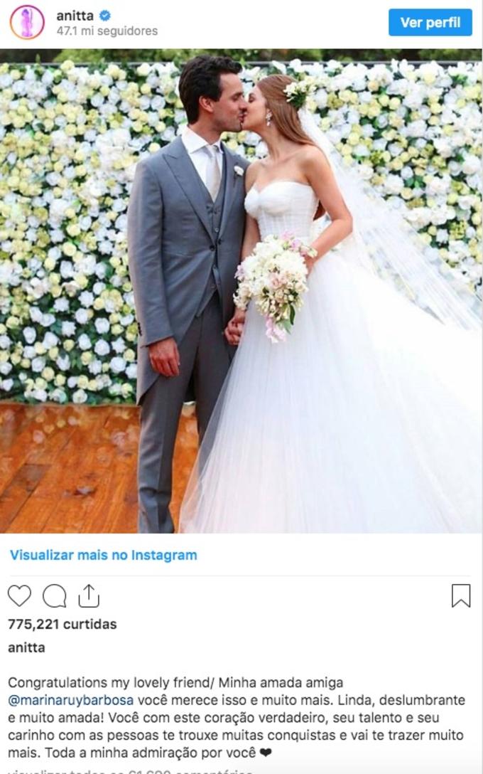 Outro detalhe é que Marina Ruy Barbosa e Anitta costumavam trocar elogios nas redes sociais e a cantora chegou a fazer um post homenageando a atriz no dia de seu casamento: "Você merece isso e muito mais", disse à época.