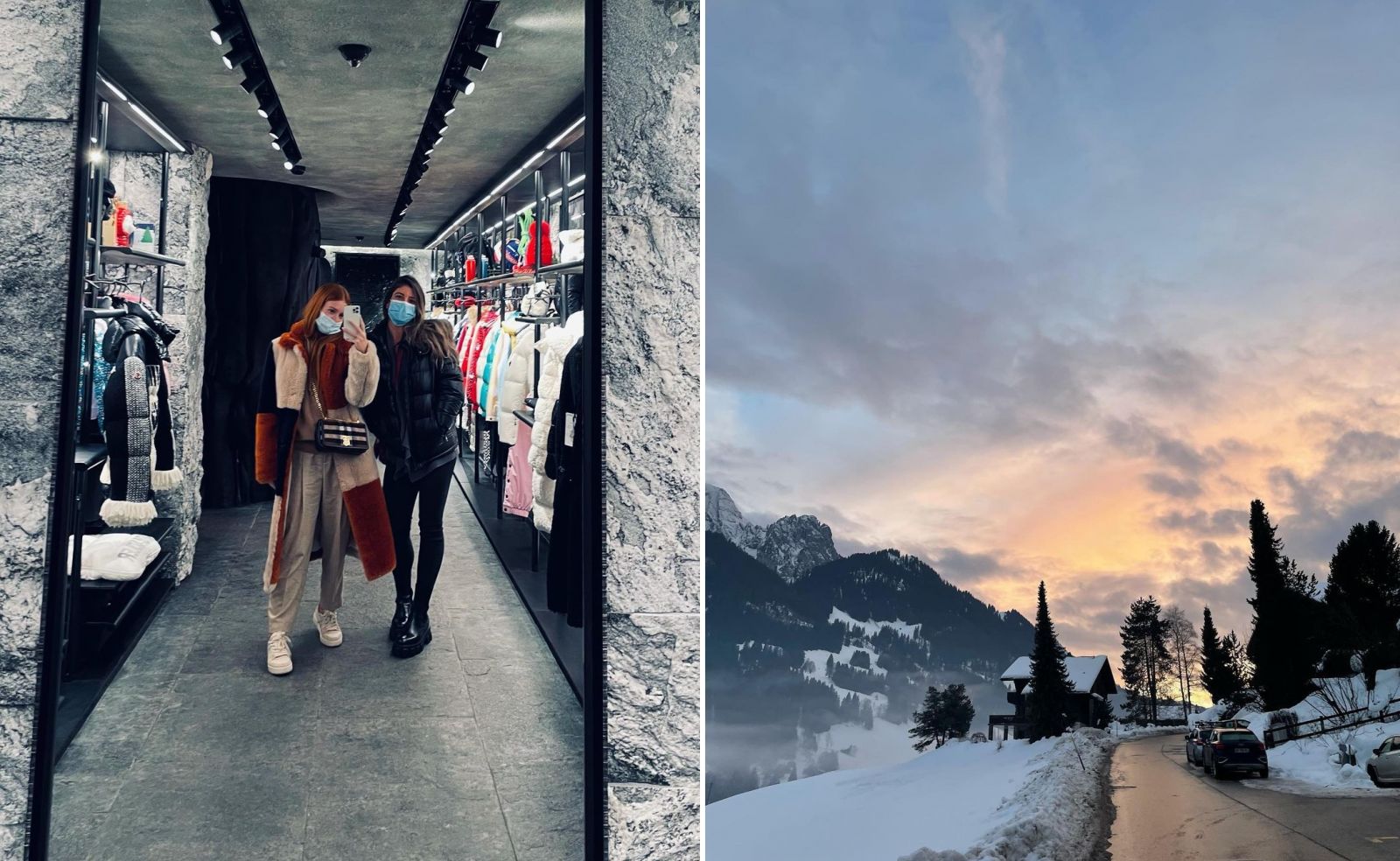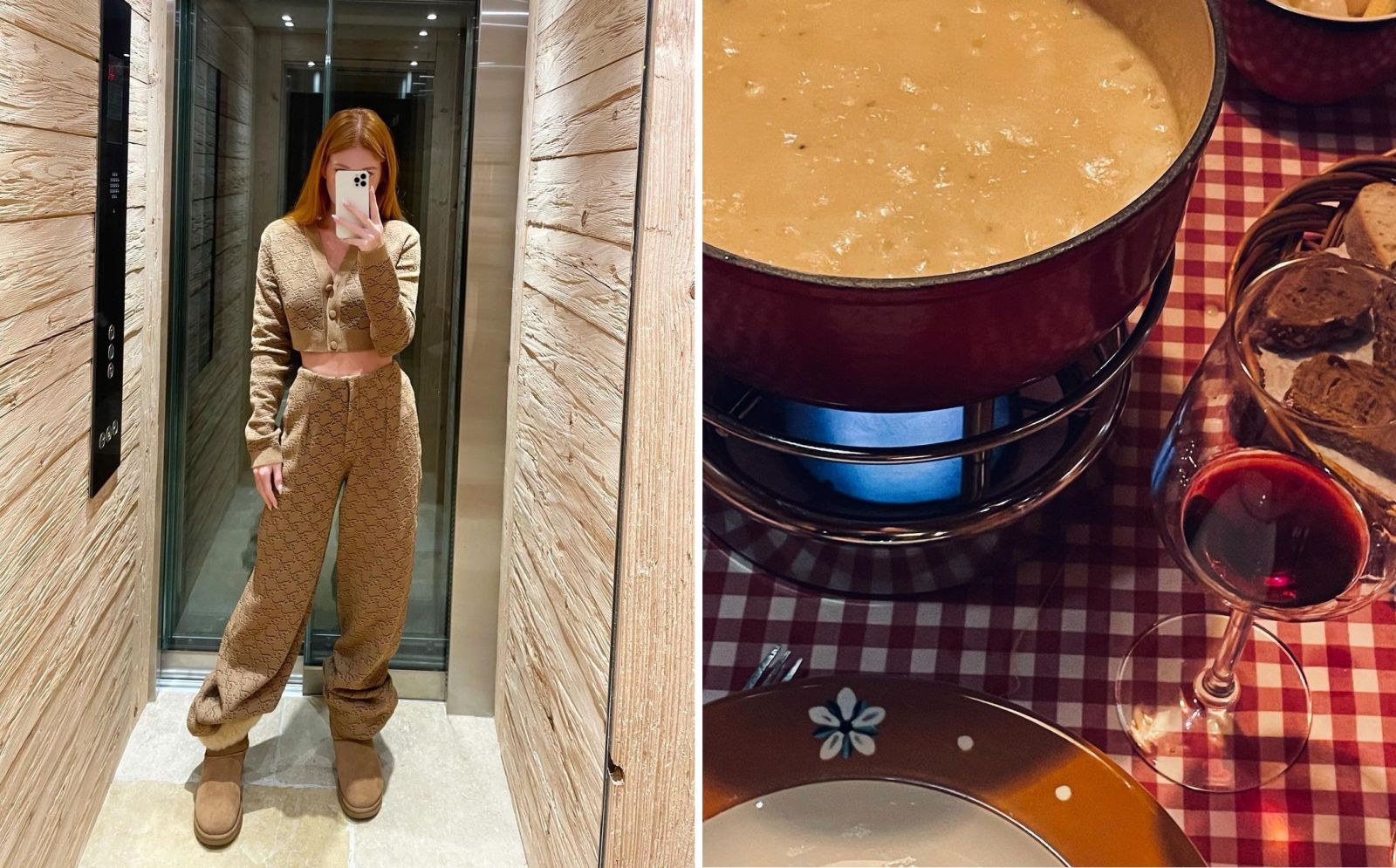 Marina publicou um rolo de fotos da viagem, com imagens do vilarejo nevado ao pôr do sol, de uma lareira, de um jantar de fondue com vinho, e uma foto ao lado de uma amiga em um closet recheado de roupas de frio. Entre as imagens, a ruiva postou uma discreta foto no reflexo de uma porta espelhada, ao lado do namorado.