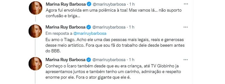 “Agora fui envolvida em uma polêmica à toa! Mas vamos lá… não suporto confusão e briga… Eu amo o Tiago. Acho ele uma das pessoas mais legais, reais e generosas desse meio artístico. Fora que sou fã do trabalho dele desde beeem antes do BBB. Conheço o Ícaro também desde que eu era criança, até TV Globinho ja apresentamos juntos e também tenho um carinho, admiração e respeito enorme por ele. Fora o ator gigante que ele é. O que EU acredito é que a gente pode ter opinião sobre tudo mas deve tomar cuidado pra não machucar e ferir outras pessoas e quem está ao nosso redor. Por outro lado acho que todo mundo está aprendendo a lidar constantemente com a loucura que é esse mundo de rede social e seus efeitos e consequências. Então, queria só pedir pra que parem de colocar as pessoas de um lado ou de outro nessa história. Não é uma competição. E ninguém precisa odiar o Tiago pra gostar do Ícaro, nem odiar o Ícaro pra gostar do Tiago. Parem :)”.