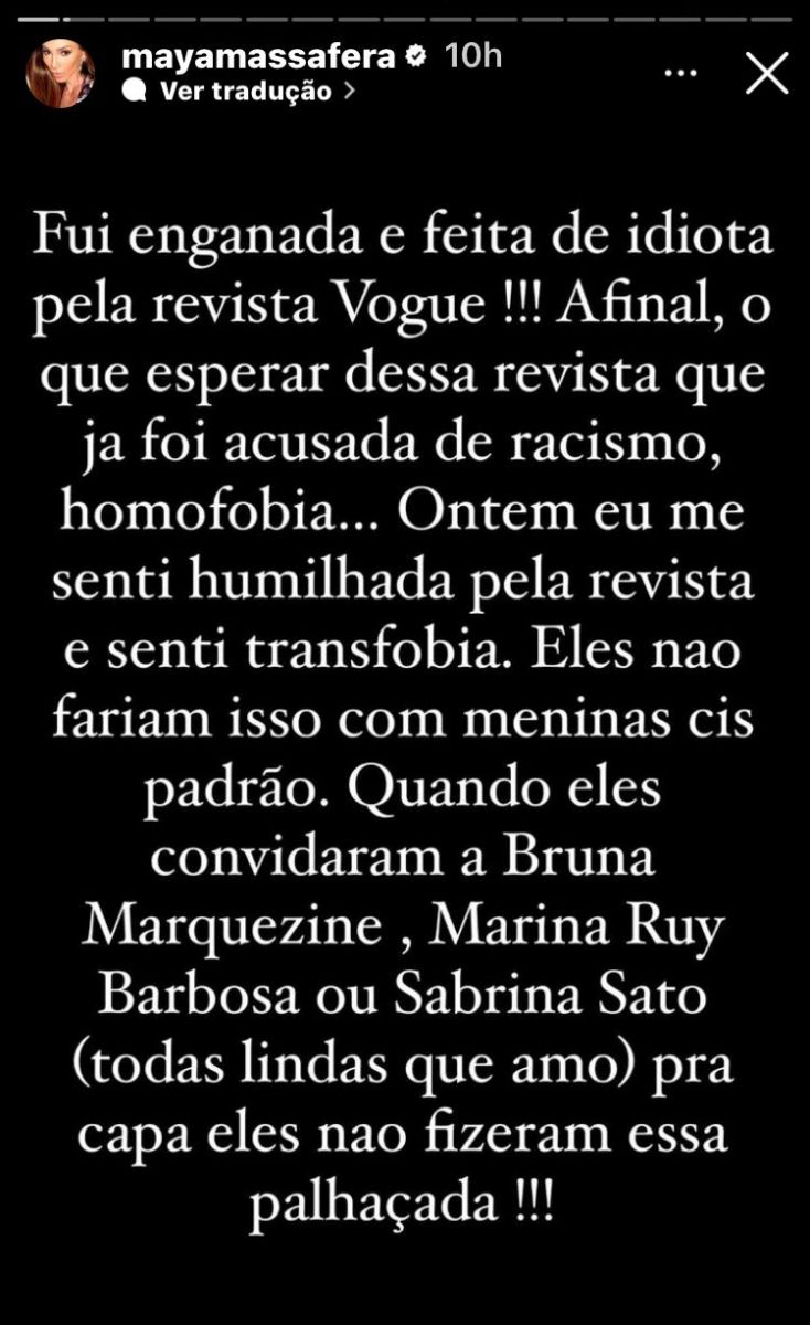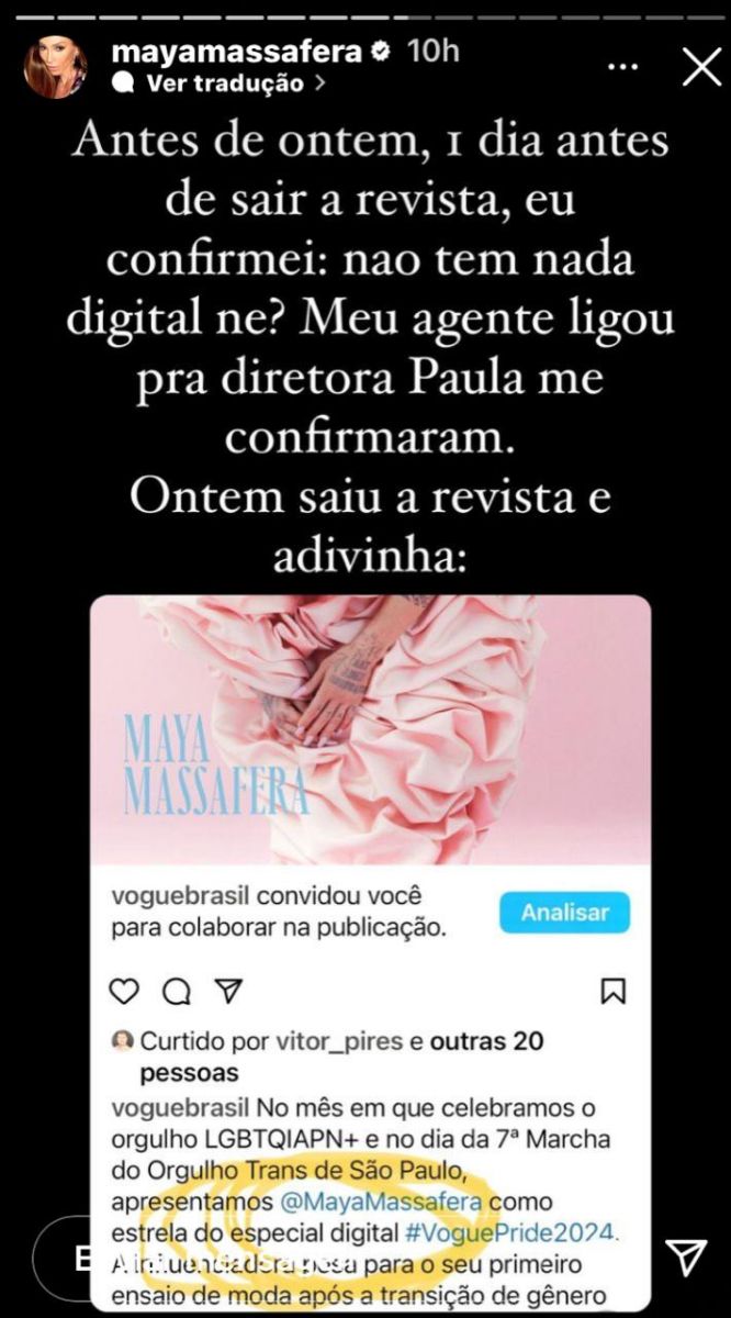 A modelo trans Maya Massafera publicou uma sequência de stories em seu Instagram, neste sábado (1), dizendo que foi ‘enganada’ pela revista Vogue. Após ser anunciada como capa da Vogue deste mês, que é comemorado o Orgulho LGBTQIAPN+, ela desabafou em seu perfil.