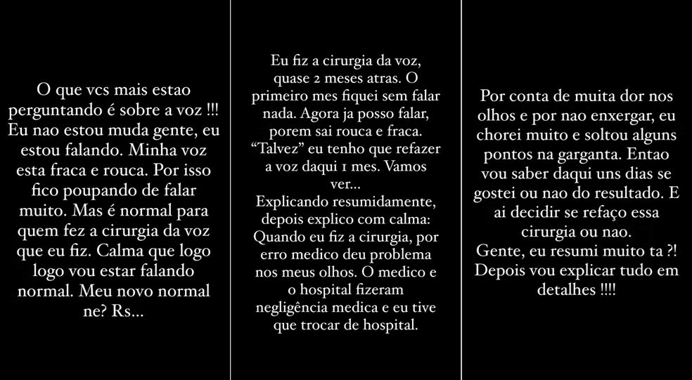A influenciadora vem sendo chamada de 'muda' por internautas desde que reapareceu mostrando as mudanças no corpo. Maya contou que, de fato, teve a voz afetada devido à cirurgia, e voltou a citar o erro médico do qual foi vítima, que a deixou temporariamente cega e sem falar por um mês.