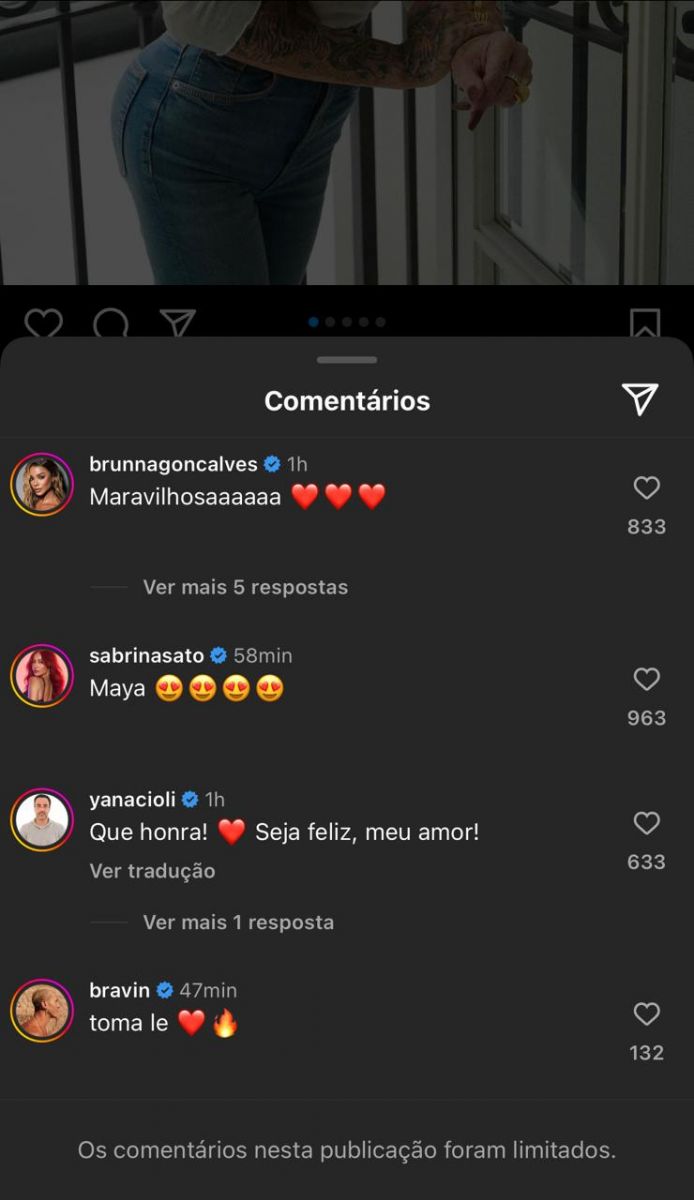 Maya recebeu diversos elogios dos amigos famosos. "Linda", comentou a cantora Lexa. "Mana do céu, ficou ainda mais linda! Que essa nova fase te traga ainda mais alegrias e amor próprio!", disse a amazonense Viviam Amorim.