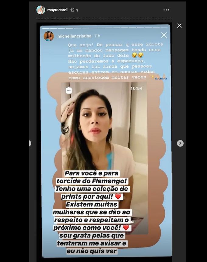 Ao saber da história, Mayra desabafou no stories do Instagram. “[Mandou mensagem] Para você e para torcida do Flamengo! Tenho uma coleção de prints por aqui! Existem muitas mulheres que se dão ao respeito e respeitam o próximo como você! Sou grata pelas que tentaram me avisar e eu não quis ver”, escreveu Mayra.