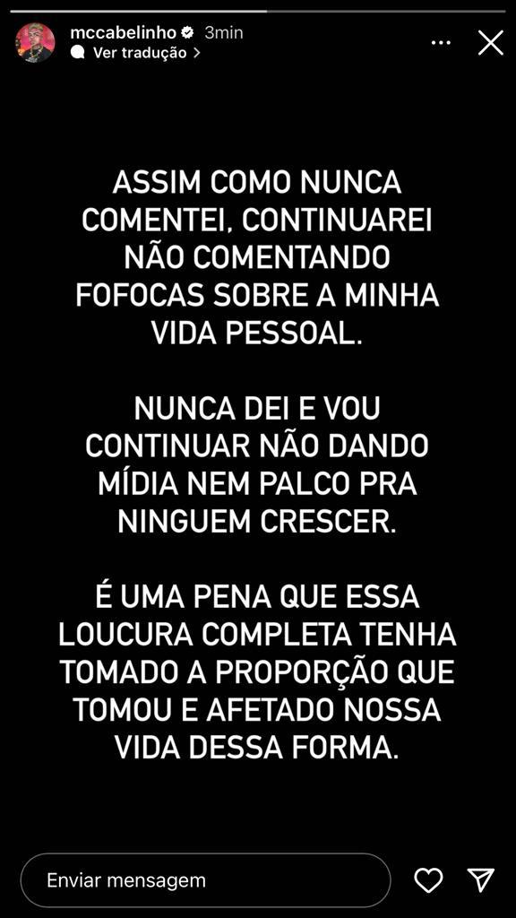 O funkeiro postou um comunicado no Instagram após Bella confirmar o fim do relacionamento "por motivos óbvios". Ele escreveu: "Continuarei não comentando fofocas sobre a minha vida pessoal. Nunca dei e vou continuar não dando mídia, nem palco para ninguém crescer".