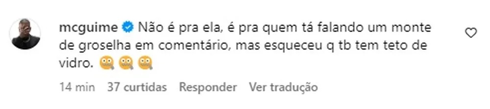 . "Não é para ela, é para quem está falando um monte de groselha em comentário, mas esqueceu que também tem teto de vidro", comentou ele em uma página do Instagram.