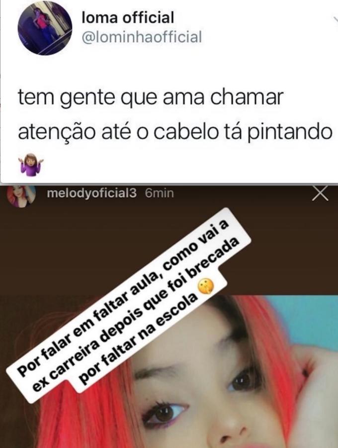 Briga no mundo das MCs mirins. MC Loma e MC Melody bateram boca nas redes sociais após a dona do hit “Envolvimento” soltar uma indireta sobre cabelo pintado.