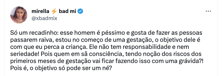"Só um recadinho: esse homem é péssimo e gosta de fazer as pessoas passarem raiva, estou no começo de uma gestação, o objetivo dele é com que eu perca a criança. Ele não tem responsabilidade e nem seriedade! Pois quem em sã consciência, tendo noção dos riscos dos primeiros meses de gestação vai ficar fazendo isso com uma grávida?! Pois é, o objetivo só pode ser um né?" , disparou ela no Twitter.