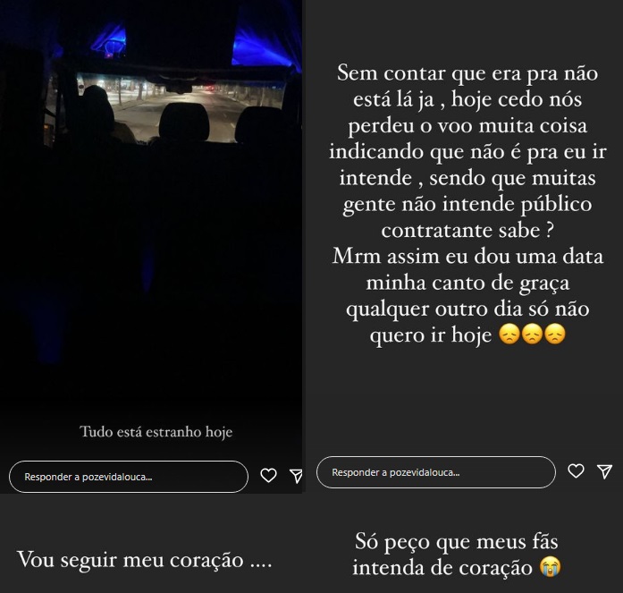 Nos Stories do Instagram, no dia anterior ao show, ele já vinha demonstrando melancolia, com stories chorando ao lado da filha, e ao invés de embarcar, revelou que desistiu e resolveu ficar em casa com seus filhos e amigos.