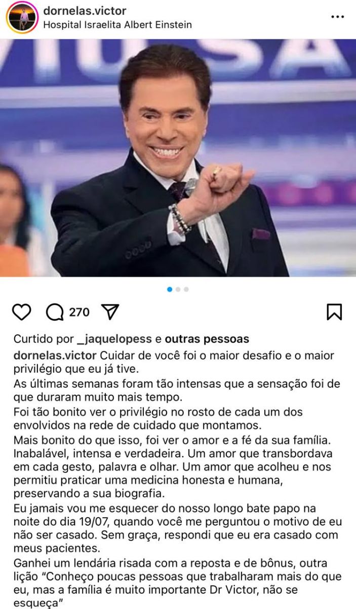 Victor publicou algumas fotos de Silvio e afirmou ter sido "o maior desafio e maior privilégio" ter cuidado do apresentador. "Cuidar de você foi o maior desafio e o maior privilégio que eu já tive. 'As últimas semanas foram tão intensas que a sensação foi de que duraram muito mais tempo. Foi tão bonito ver o privilégio no rosto de cada um dos envolvidos na rede de cuidado que montamos", escreveu.
