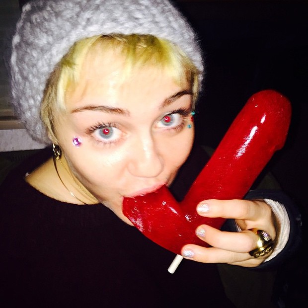 Miley Cyrus não para de causar polêmica, e, mais uma vez, na madrugada desta quarta-feira (17), a cantora não deixou por menos e causou alvoraçoro na web. Em uma foto compartilhada por uma amiga da loirinha no Instagram, Miley aparece chupando um pirulito em formato de pênis. “Ela comeu as bolas” escreveu a amiga da cantora, Katy Weaver.