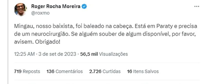 A informação foi dada nas redes sociais pelo vocalista do grupo, Roger Moreira, e veio acompanhada de um apelo: "Mingau, nosso baixista, foi baleado na cabeça. Está em Paraty e precisa de um neurocirurgião. Se alguém souber de algum disponível, por favor, avisem. Obrigado!", escreveu.