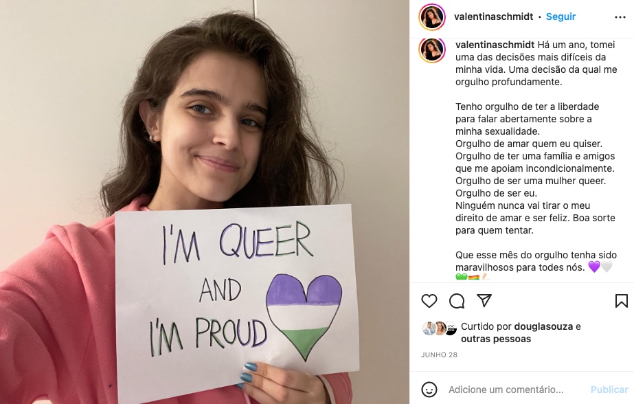 “Durante anos, tive muita dificuldade em me aceitar e me amar, e isso bloqueou um pouco meu amor por outras pessoas. Então, depois de anos de dúvidas, cheguei a uma conclusão da qual me orgulho e finalmente me sinto confortável: sou queer, ou seja, no meu caso, minha orientação sexual e atração emocional não se encaixam nos padrões da heteronormatividade. Eu me amo e amo todos vocês. Este sou eu. Simples assim”, escreveu Valentina no Dia Internacional do Orgulho LGBT+ de 2021.