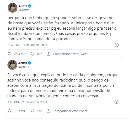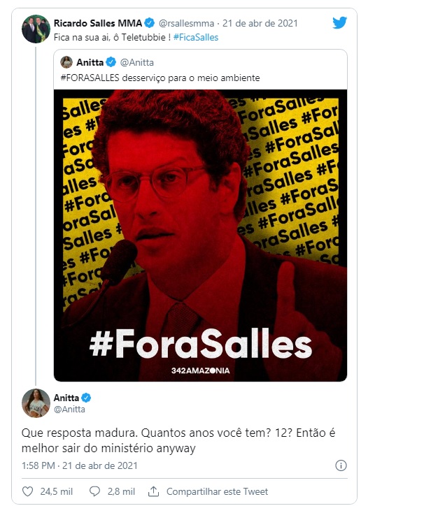 "Fora Salles, desserviço para o meio ambiente", publicou Anitta. Ele rebateu: "Fica na sua aí, ô teletubbie! Fica Salles". Anitta passou a responder o ministro, e a discussão rolou solta na rede social. Confira abaixo como foi: